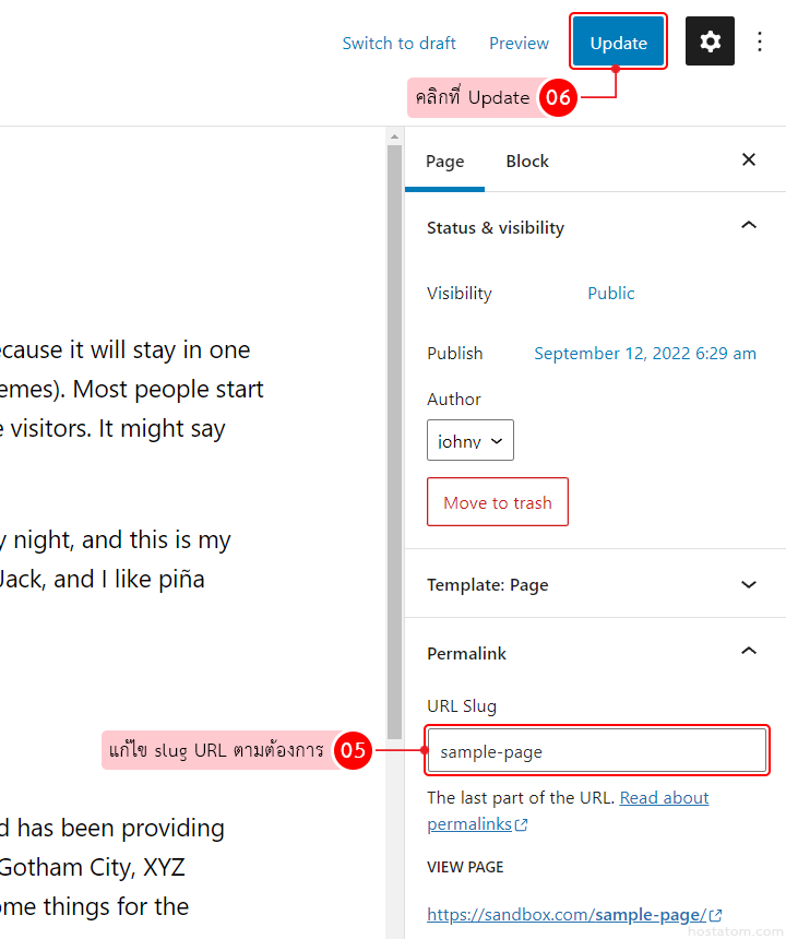 แก้ไข slug URL ในช่อง Slug ตามต้องการ จากนั้นคลิกที่ Update