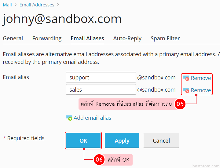 คลิกที่ Remove ที่อีเมล alias ที่ต้องการลบ จากนั้นคลิกที่ OK