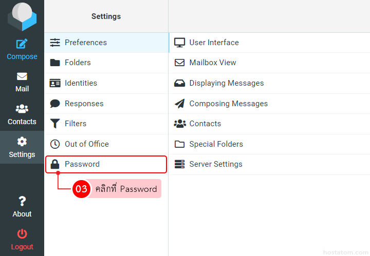 ในกรณีที่ใช้งานอีเมลใน Roundcube หากต้องการเปลี่ยนรหัสผ่าน สามารถทำได้ตามขั้นตอนต่อไปนี้