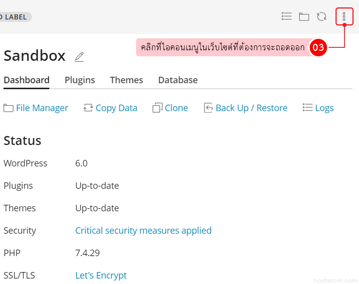 คลิกที่ไอคอนเมนูในเว็บไซต์ WordPress ที่ต้องการจะถอดออก