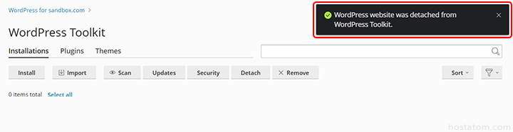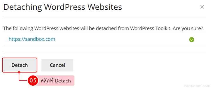 ระบบจะแสดงหน้าต่างให้ยืนยันว่าต้องการถอดเว็บไซต์ WordPress ดังกล่าวออกจาก WordPress Toolkit หรือไม่ ให้คลิกที่ Detach