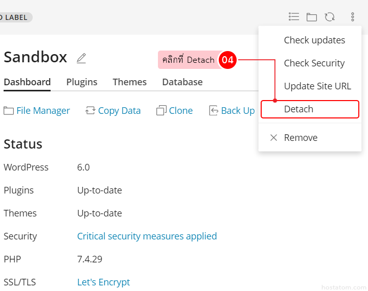 การ detach ของ WordPress Toolkit นั้น จะเป็นการถอดเว็บไซต์ WordPress ออกจาก WordPress Toolkit แต่ข้อมูลเว็บไซต์ WordPress หรือฐานข้อมูลจะยังคงอยู่เหมือนเดิม (เมื่อกลับไปยังหน้าหลักของ Plesk จะยังเห็นเว็บไซต์ WordPress นั้นได้อยู่) โดยสามารถทำได้ตามขั้นตอนต่อไปนี้