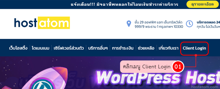 1. Login เข้าส่วนบริการลูกค้า โดยพิมพ์ www.hostatom.com จากนั้นคลิกที่ Client Login