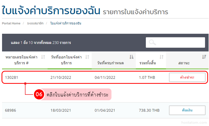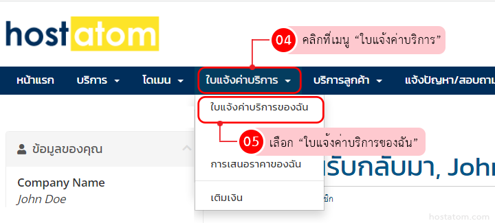 เมื่อเข้าส่วนบริการลูกค้าของเรา ให้เลือก ใบแจ้งค่าบริการ -> ใบแจ้งค่าบริการของฉัน