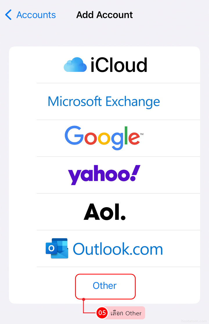 เลือกประเภทอีเมลที่ต้องการเพิ่ม จากตัวอย่างนี้เป็นการเพิ่มอีเมลที่ใช้งานจากโฮสติ้ง ให้เลือก Other