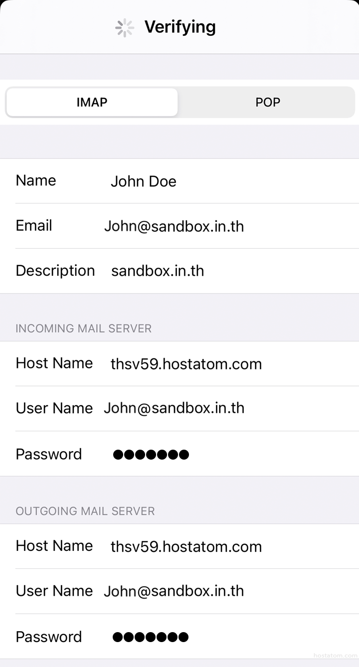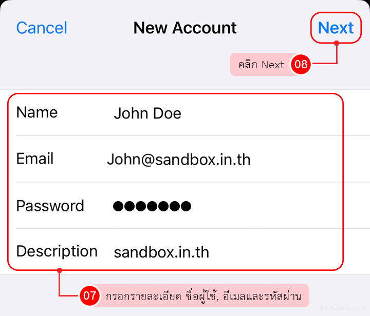 - Host Name: ชื่อโฮสติ้งที่ใช้งานอีเมลอยู่ หากเป็นของโฮสอะตอมให้ใส่ thsv แล้วตามด้วยหมายเลขเครื่อง Server ที่ใช้งาน แล้วต่อด้วย .hostatom.com เช่น thsv99.hostatom.com