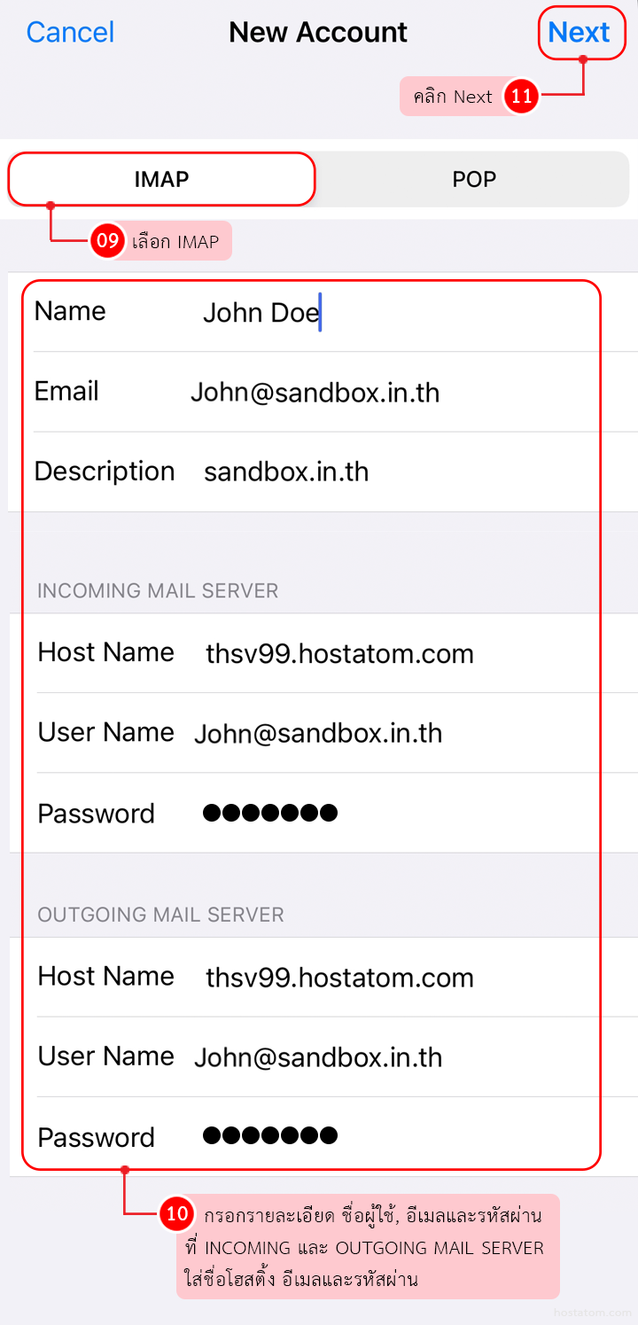 ในการตั้งค่าให้เลือกแบบ IMAP จากนั้นใส่รายละเอียด ดังนี้