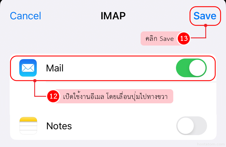 เมื่อการเชื่อมต่อสำเร็จ หากต้องการใช้งานอีเมลบน iPhone หรือ iPad เลย ให้เลื่อนปุ่มไปทางขวา ดังภาพ