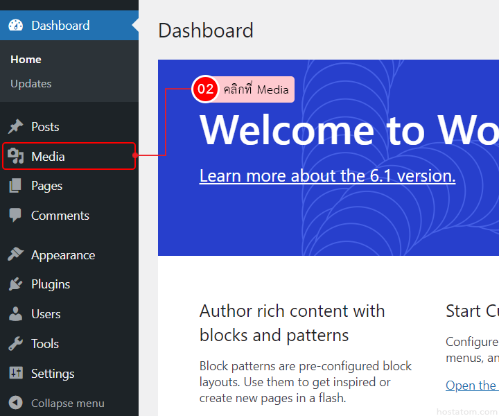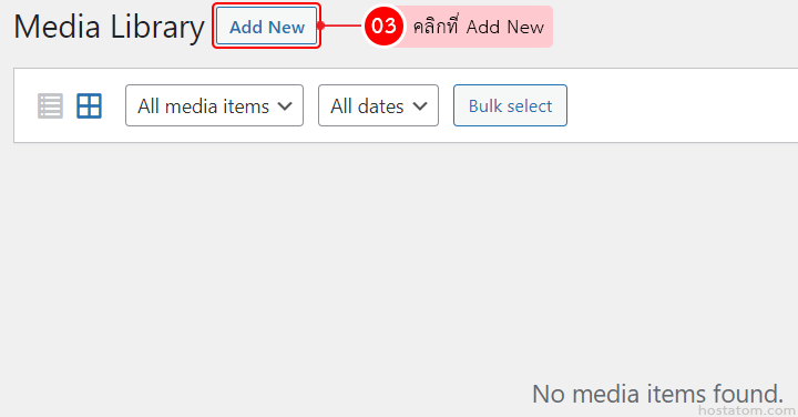 ในหลังบ้านของ WordPress นั้นจะมี media library ไว้สำหรับจัดการไฟล์สื่อต่างๆ ไม่ว่าจะเป็น ไฟล์รูป ไฟล์วิดีโอ ไฟล์เสียง ไฟล์เอกสาร และไฟล์อื่นๆ เป็นต้น โดยเราสามารถอัปโหลดไฟล์ดังกล่าวขึ้นไปยัง media library เพื่อนำไปใช้งานในเว็บไซต์ได้ตามขั้นตอนต่อไปนี้