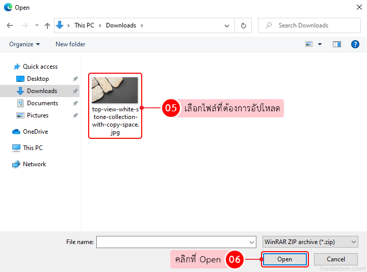 เลือกไฟล์ที่ต้องการอัปโหลด จากนั้นคลิกที่ Open