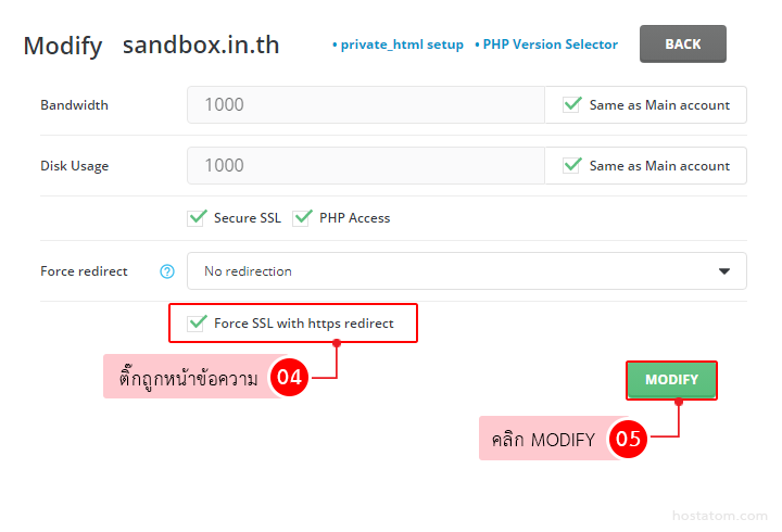 1. ติ๊กถูกหน้าข้อความ Force SSL with https redirect จากนั้นคลิกที่ปุ่ม MODIFY
