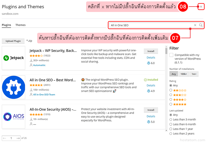 หากมีปลั๊กอินที่ต้องการติดตั้งเพิ่มเติมให้ค้นหาปลั๊กอินที่ต้องการติดตั้งในช่องค้นหา หรือหากไม่มีปลั๊กอินที่ต้องการติดตั้งแล้วให้คลิกที่ x