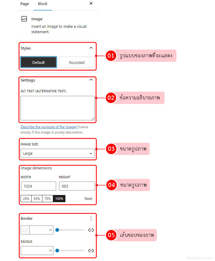 ในเรื่องของการตั้งค่าต่างๆ ของ Image ที่ด้านขวามือจะมี Option เพื่อให้ภาพที่ใช้นั้นแสดงผลตามต้องการ โดยมีรายละเอียดดังนี้