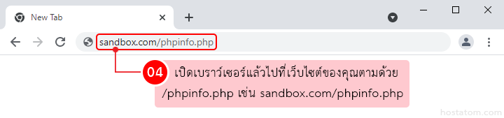 เปิดเบราว์เซอร์แล้วไปที่เว็บไซต์ของคุณตามตำแหน่งที่ upload ไฟล์ไว้ซึ่งจากตัวอย่างคือ /phpinfo.php ดังนั้นหากเว็บของเราชื่อ sandbox.com ก็ให้เรียก http://sandbox.com/phpinfo.php