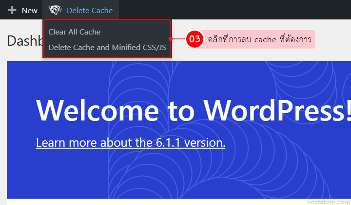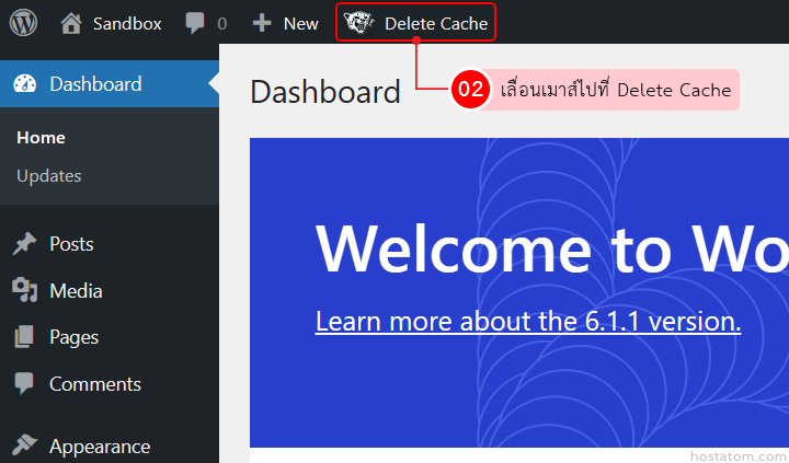เลื่อนเมาส์ไปที่ Delete Cache ใน Admin Bar