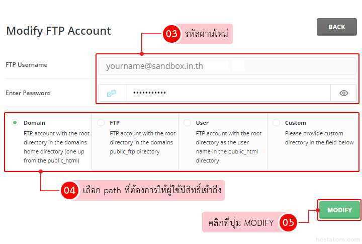 ในหน้า ModifyFTP Password ที่ FTP Username ให้ใส่ password ที่ต้องการเปลี่ยน และที่ Enter Password ใส่รหัสผ่านใหม่ จากนั้นเลือก path ที่ต้องการให้ผู้ใช้มีสิทธิ์เข้าถึง เมื่อเรียบร้อยแล้วให้คลิกที่ปุ่ม Modify