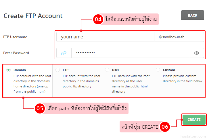 ในหน้า Create FTP Account ให้ระบุรายละเอียด รวมถึงสิทธิ์การเข้าถึงของบัญชี FTP ที่ต้องการสร้าง โดยมีรายละเอียด ดังนี้