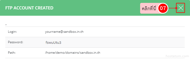 หมายเหตุ: username ที่ได้จะมีหน้าตาเหมือนบัญชี Email แต่ใช้รับส่งเมลไม่ได้นะคะ ชื่อโดเมนหลังเครื่องหมาย @ มีไว้เพื่อบอกว่าบัญชี FTP นี้เป็นของโดเมนอะไรเท่านั้น