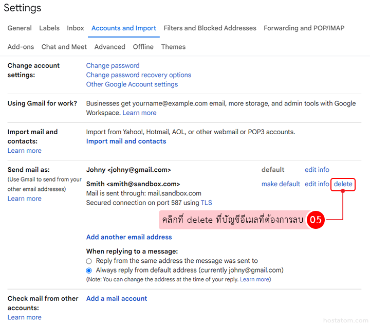 คลิกที่ delete ที่บัญชีอีเมลที่ต้องการลบ