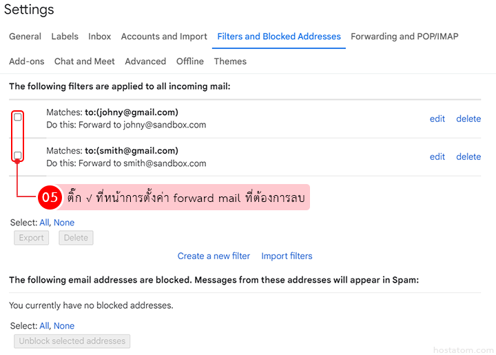 ติ๊กถูกที่หน้าการตั้งค่า forward mail ที่ต้องการลบ