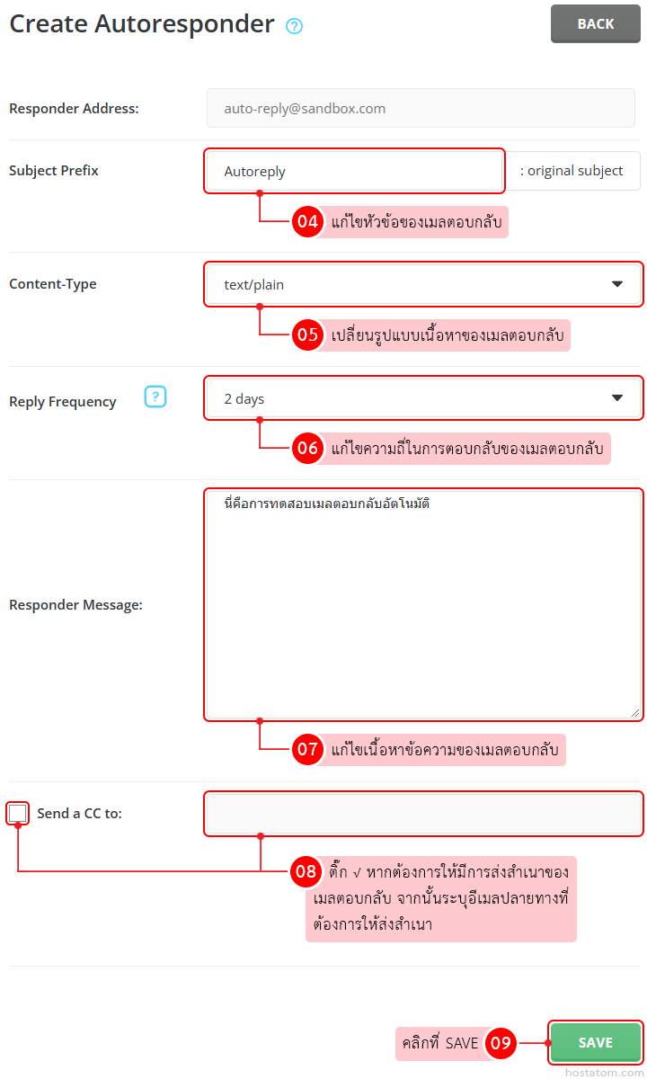 แก้ไขข้อมูลของ autoresponder ตามที่ต้องการ จากนั้นคลิกที่ SAVE