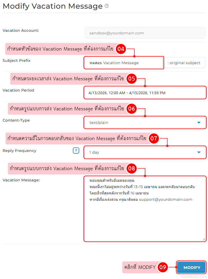 แก้ไขข้อมูลของ Vacation Message ตามที่ต้องการ จากนั้นคลิกที่ MODIFY