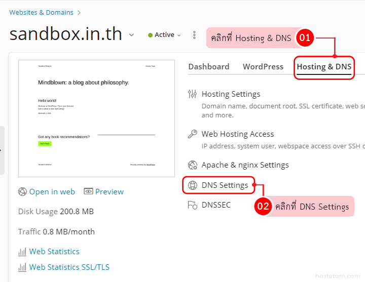 ในหน้า Dashboard ของโดเมนให้คลิกที่ Hosting & DNS => DNS Settings