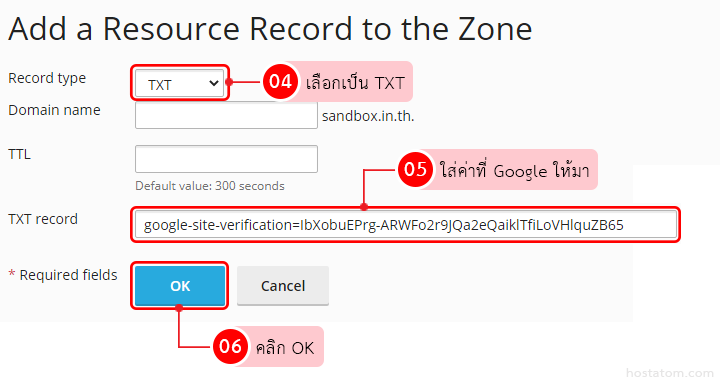 - TXT Record: ให้ใส่ค่าตามที่ Google ให้มา จากตัวอย่างนี้ขอใช้ค่า google-site-verification=IbXobuEPrg-ARWFo2r9JQa2eQaiklTfiLoVHlquZB65