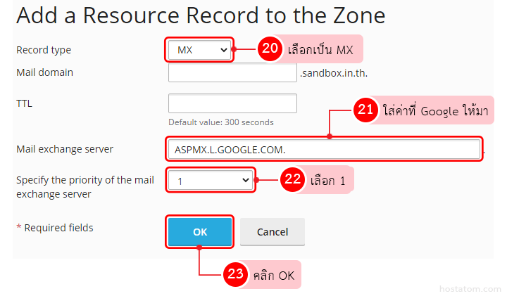 ส่วนการเพิ่มค่า MX Records ที่เหลือ ให้ทำเหมือนเพิ่มค่า MX Records ในครั้งแรก เพียงแต่ข้อ 21 ช่องแรกให้ใส่ค่า Record และ Specify the priority of the mail exchange server ตามที่ทาง Google กำหนดไว้