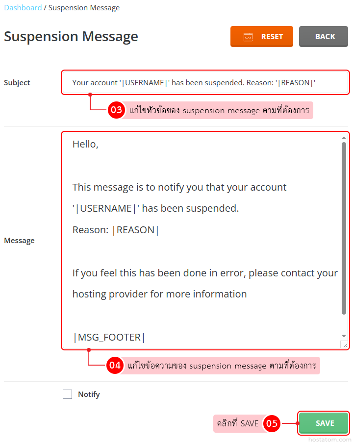 แก้ไขข้อมูลของ suspension message ตามที่ต้องการ จากนั้นคลิกที่ SAVE