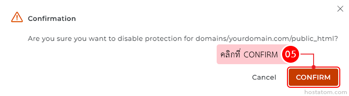 ระบบจะแสดงหน้าต่างยืนยันการลบการป้องกัน directory ที่เลือกขึ้นมา ให้คลิกที่ CONFIRM