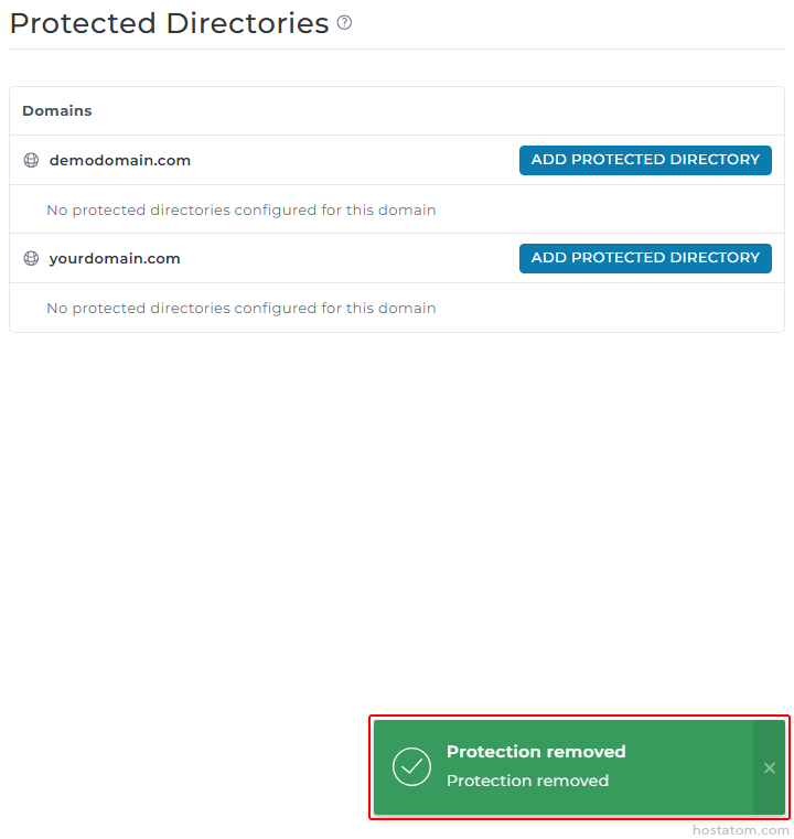 ระบบจะแจ้งว่าได้ลบการป้องกัน directory ของโดเมนดังกล่าวแล้ว