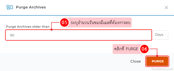 ระบุจำนวนวันของอีเมลที่ต้องการลบ (เช่น 30 วัน 90 วัน 180 วัน เป็นต้น) จากนั้นคลิกที่ PURGE