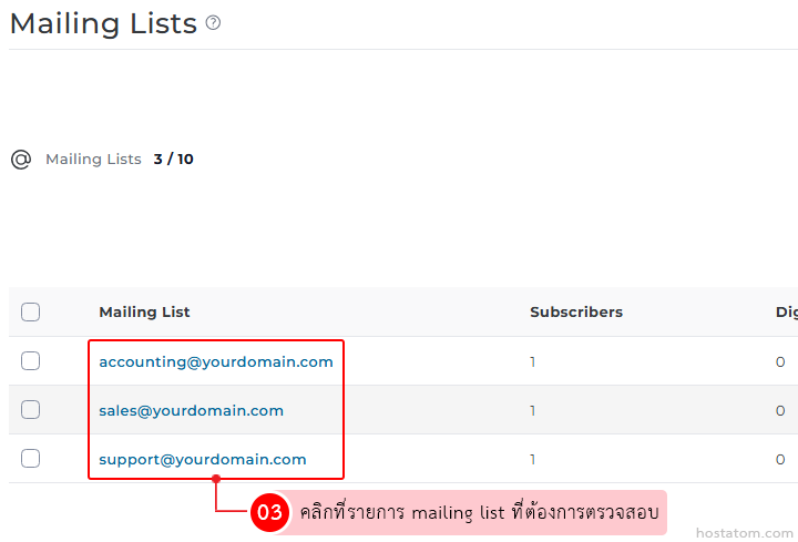 หากต้องการตรวจสอบรายชื่อที่ได้เพิ่มไว้ใน mailing list ให้คลิกที่รายการ mailing list ที่ต้องการตรวจสอบ