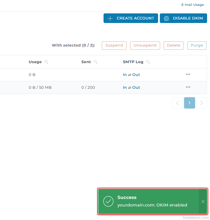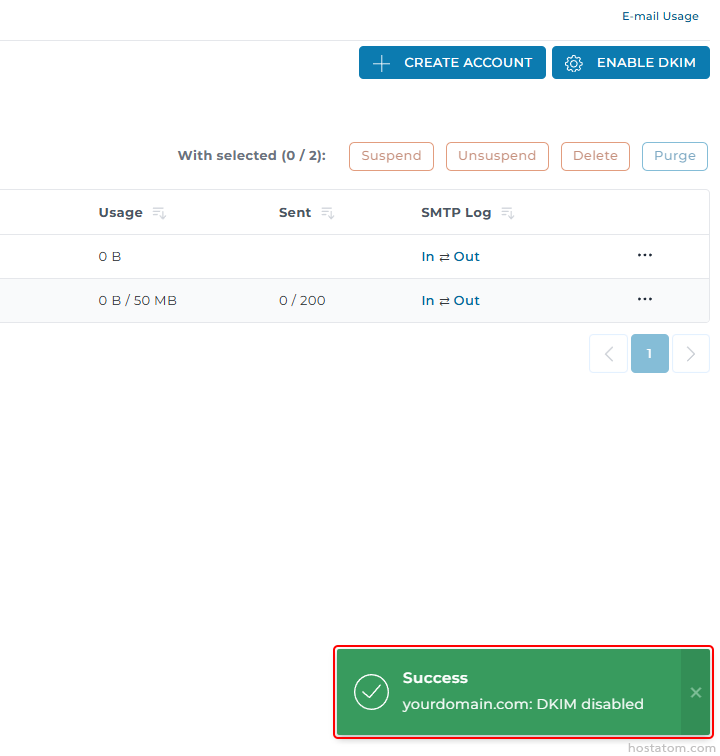 ระบบจะแจ้งว่าได้ปิดการใช้งาน DKIM สำหรับบัญชีอีเมลแล้ว