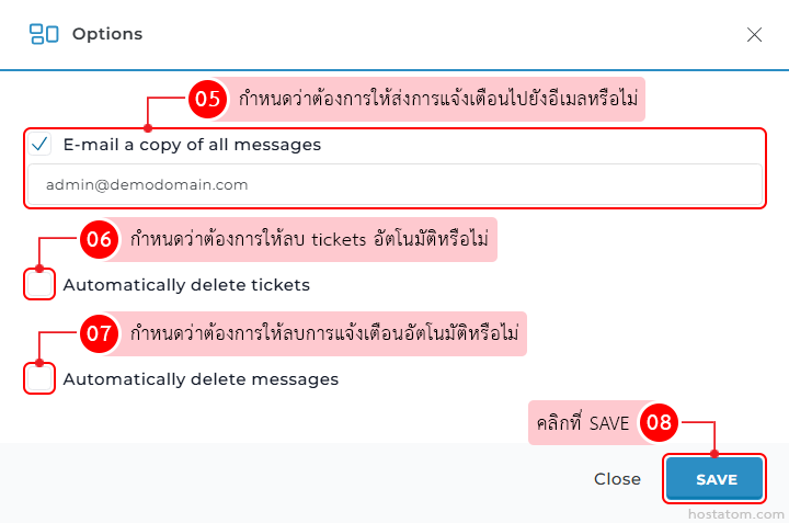 - Automatically delete messages – กำหนดว่าต้องการให้ลบการแจ้งเตือนโดยอัตโนมัติหรือไม่ ใหากติ๊ก √ ระบบจะให้ระบุจำนวนวันที่ต้องการให้ลบการแจ้งเตือนที่เก็บไว้มากกว่าวันที่กำหนด