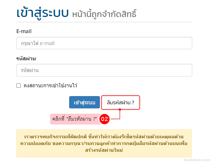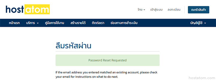 ในกรณีที่ผู้ใช้ลืมรหัสผ่านสำหรับเข้าใช้งานในส่วนบริการลูกค้าของ hostatom สามารถ reset รหัสผ่านได้ตามขั้นตอนต่อไปนี้