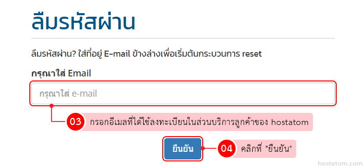 กรอกอีเมลที่ได้ใช้ลงทะเบียนในส่วนบริการลูกค้าของ hostatom ในช่อง “กรุณาใส่ Email” จากนั้นคลิกที่ “ยืนยัน”