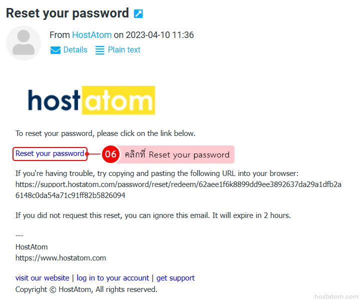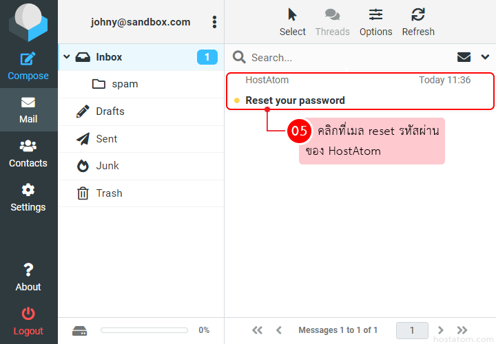 เข้าไปเช็ค inbox ของอีเมลดังกล่าว โดยเมลที่ส่งมาจะส่งมาจาก HostAtom และมีหัวข้อเป็น Reset your password เมื่อเจอแล้วให้คลิกที่เมลดังกล่าว