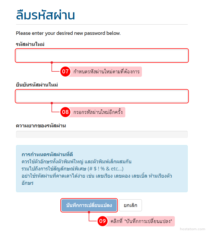 กำหนดรหัสผ่านใหม่ตามที่ต้องการในช่อง “รหัสผ่านใหม่” และกรอกรหัสผ่านใหม่อีกครั้งในช่อง “ยืนยันรหัสผ่านใหม่” จากนั้นคลิกที่ “บันทึกการเปลี่ยนแปลง”