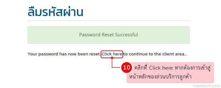 ระบบจะแจ้งว่า reset รหัสผ่านเรียบร้อยแล้ว หากต้องการเข้าสู่หน้าหลักของส่วนบริการลูกค้า ให้คลิกที่ Click here