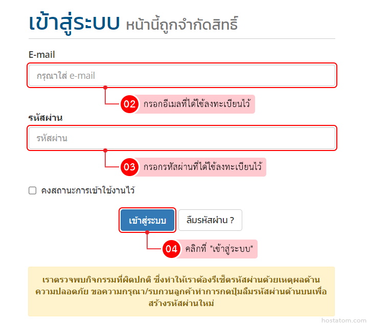 ผู้ใช้สามารถ login เข้าใช้งานบริการต่างๆ ในส่วนบริการลูกค้าของ hostatom ได้ตามขั้นตอนต่อไปนี้