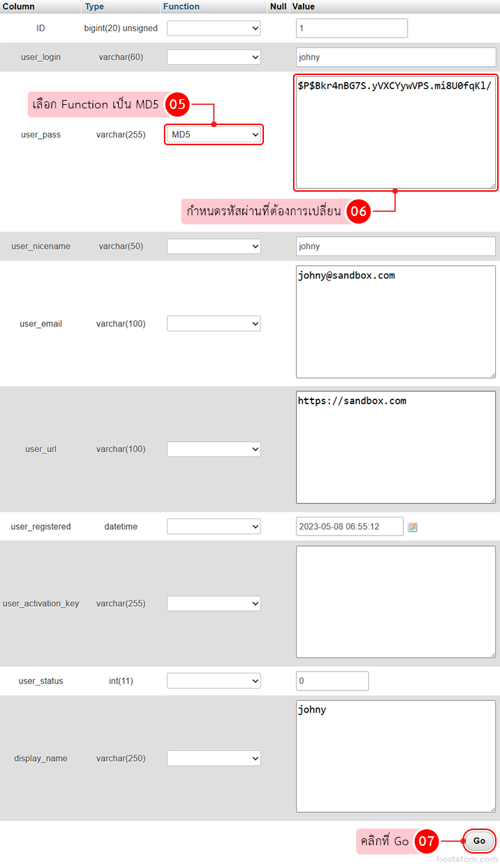 เลือก Function ใน user_pass เป็น MD5 ต่อด้วยกำหนดรหัสผ่านที่ต้องการเปลี่ยนที่ Value ใน user_pass จากนั้นคลิกที่ Go