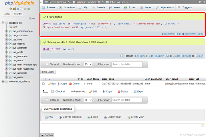 ระบบจะแจ้งว่า user_pass ของตารางฐานข้อมูลดังกล่าวได้ถูกแก้ไขแล้ว ดังภาพตัวอย่าง