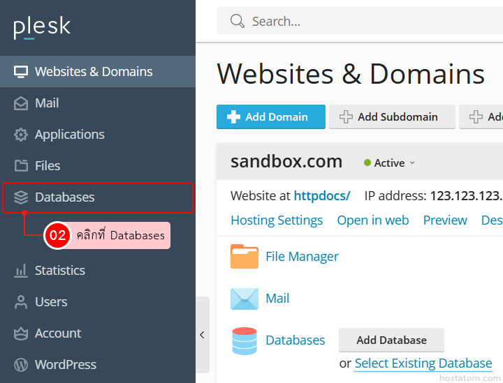 คลิกที่แท็บ Database ในโดเมนที่ต้องการเข้าใช้งาน phpMyAdmin