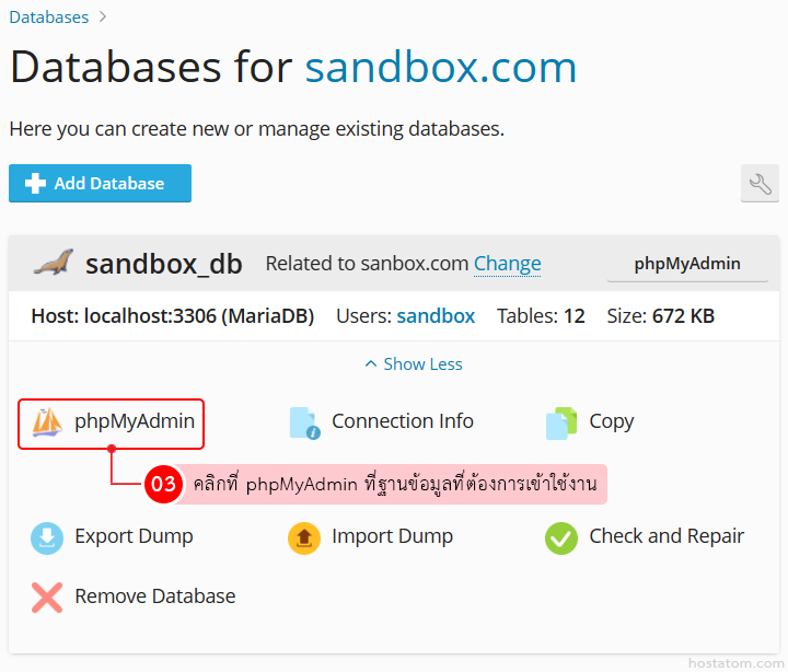 เข้าใช้งาน phpMyAdmin จากหน้า Databases