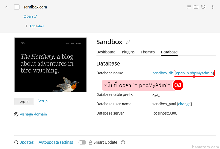 คลิกที่ open in phpMyAdmin ในหัวข้อ Database name