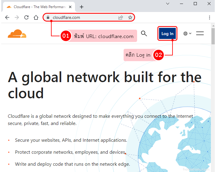 ทำการ Login เข้าสู่ Cloudflare โดยพิมพ์ URL: cloudflare.com => Log In
