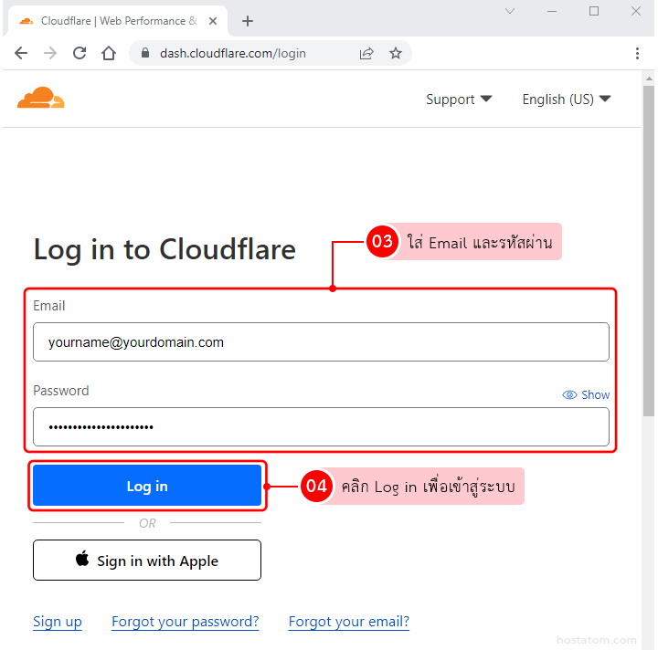 ใส่ บัญชีอีเมลที่ได้ลงทะเบียนไว้กับทาง Cloudlare และ Password จากนั้นคลิก Log in