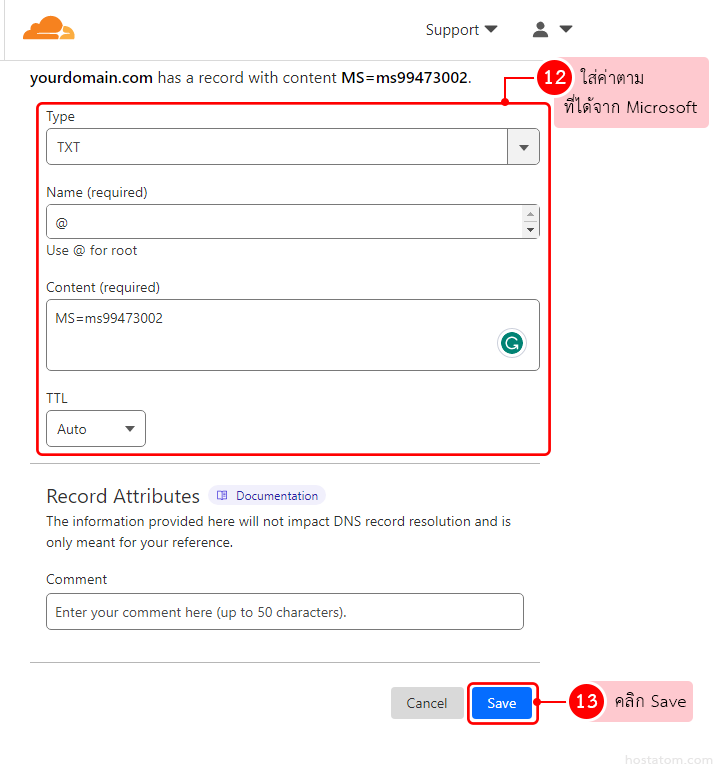 หมายเหตุ: ค่าใน Content เป็นเพียงค่าตัวอย่าง ซึ่งค่านี้คุณจะได้จากการตั้งค่าโดเมน